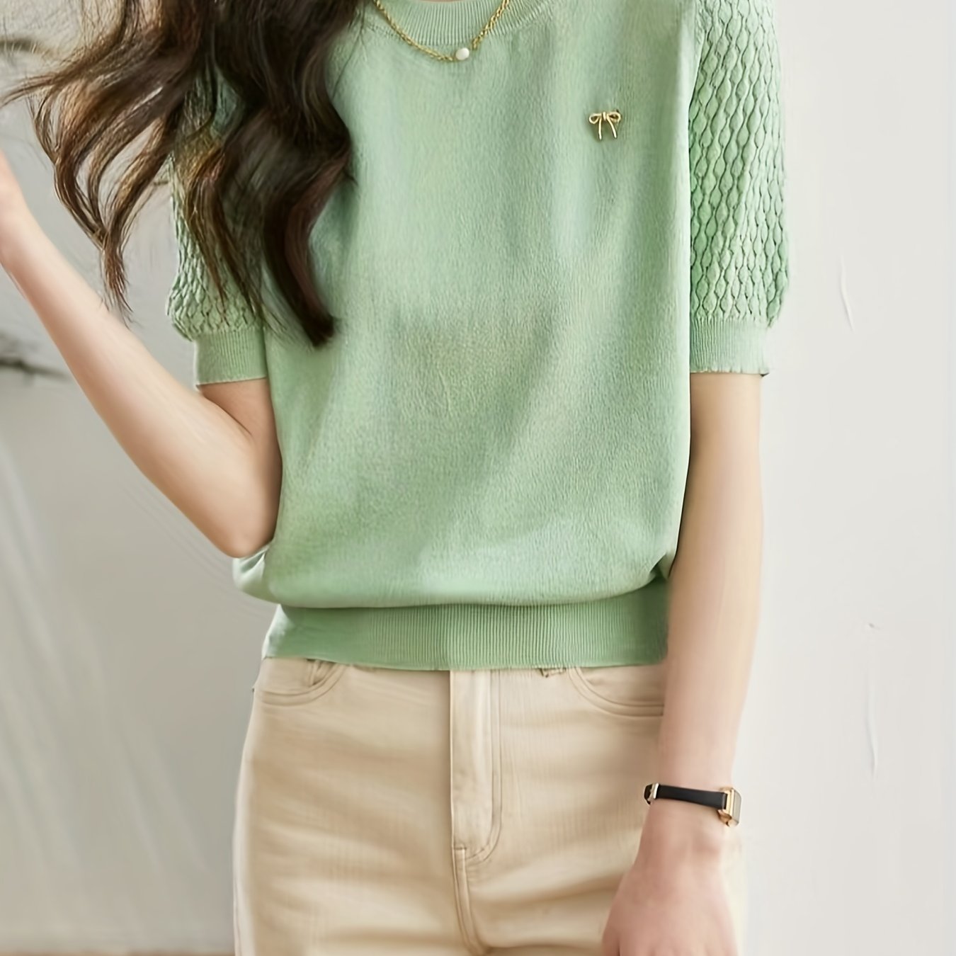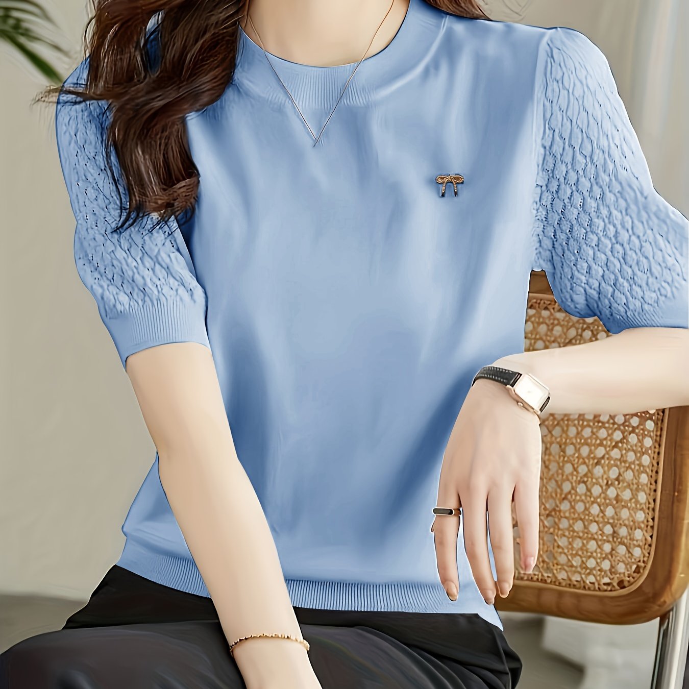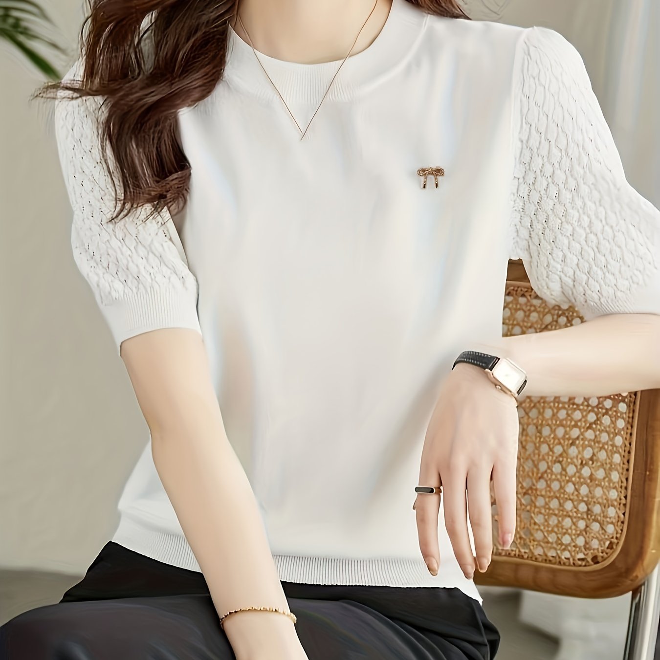 Beaded Rhinestone Crew Neck Knitted Top, Casual Short Sleeve Sweater For Spring & Summer, Women’s Clothing
