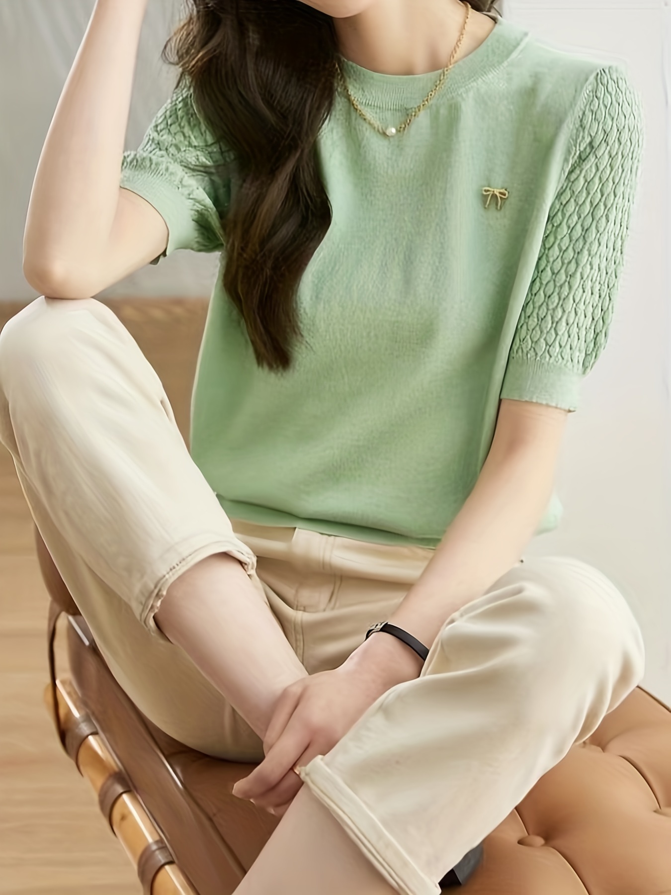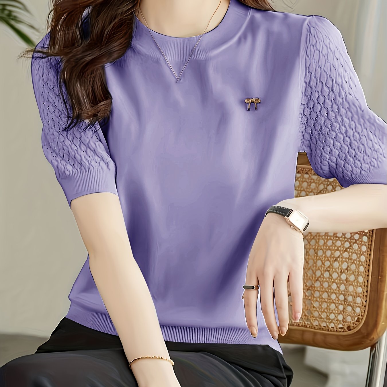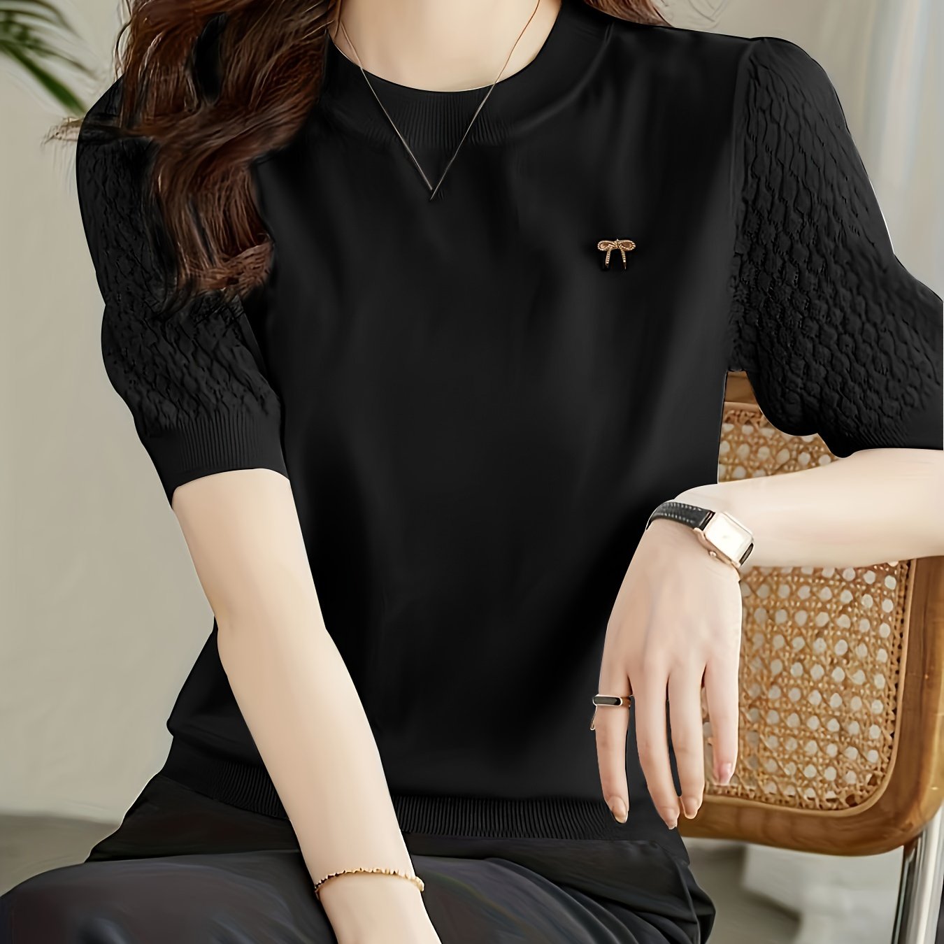 Beaded Rhinestone Crew Neck Knitted Top, Casual Short Sleeve Sweater For Spring & Summer, Women’s Clothing