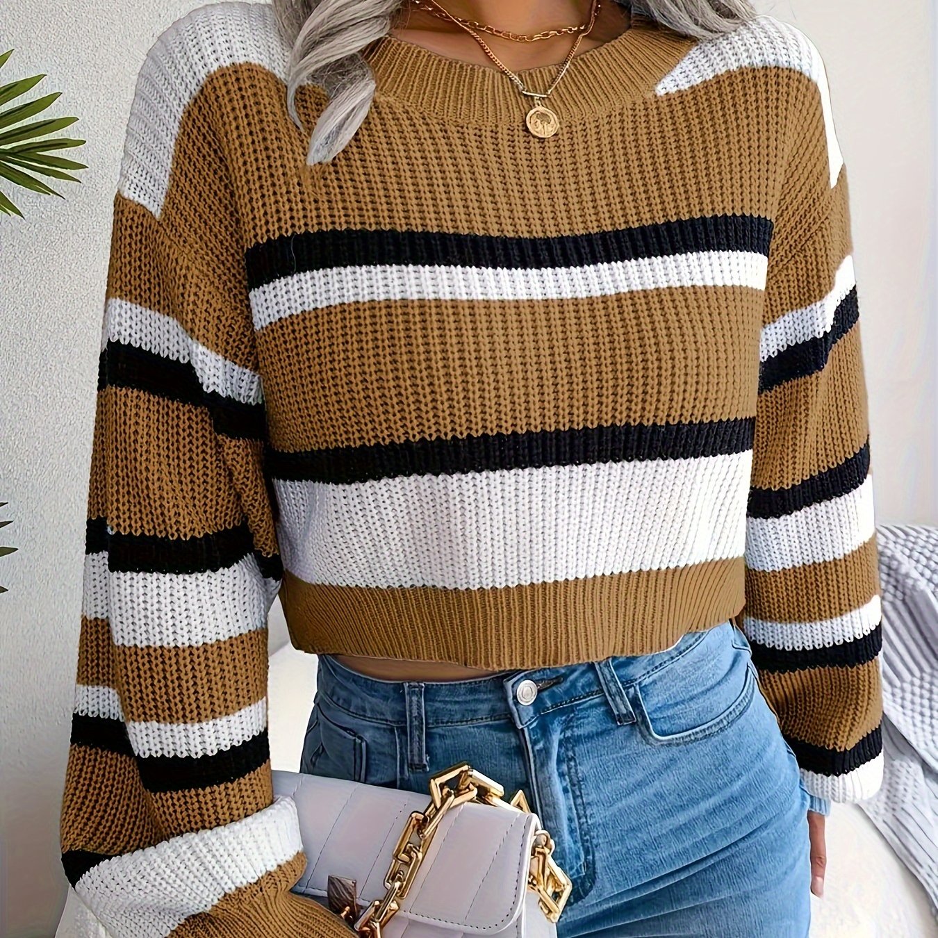 striped crew neck crop sweater casual long sleeve sweater for spring fall womens clothing details 1