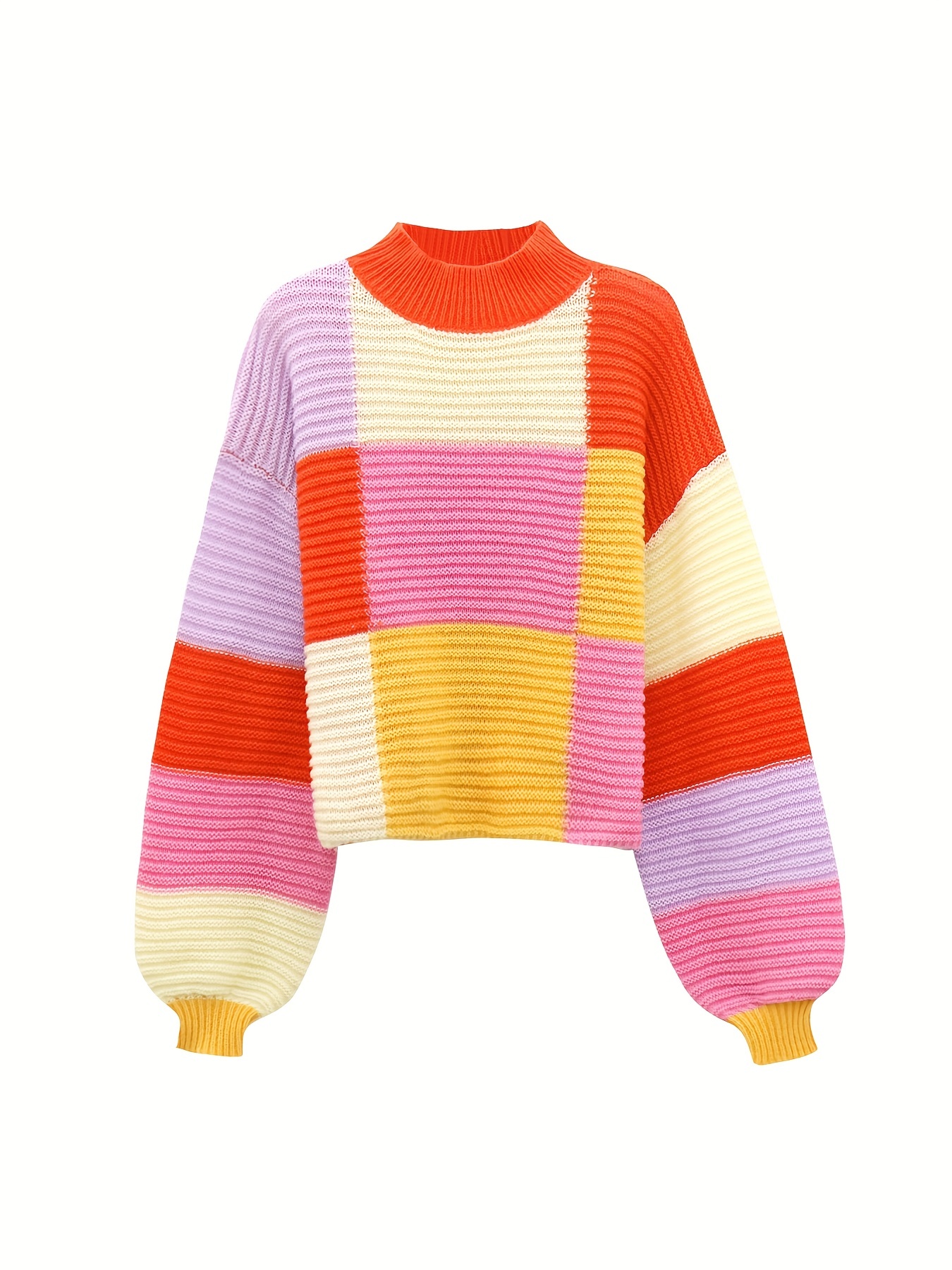 Y2K Color Block Mock Neck Pullover Sweater for Women – Long Sleeve Fall & Winter Clothing